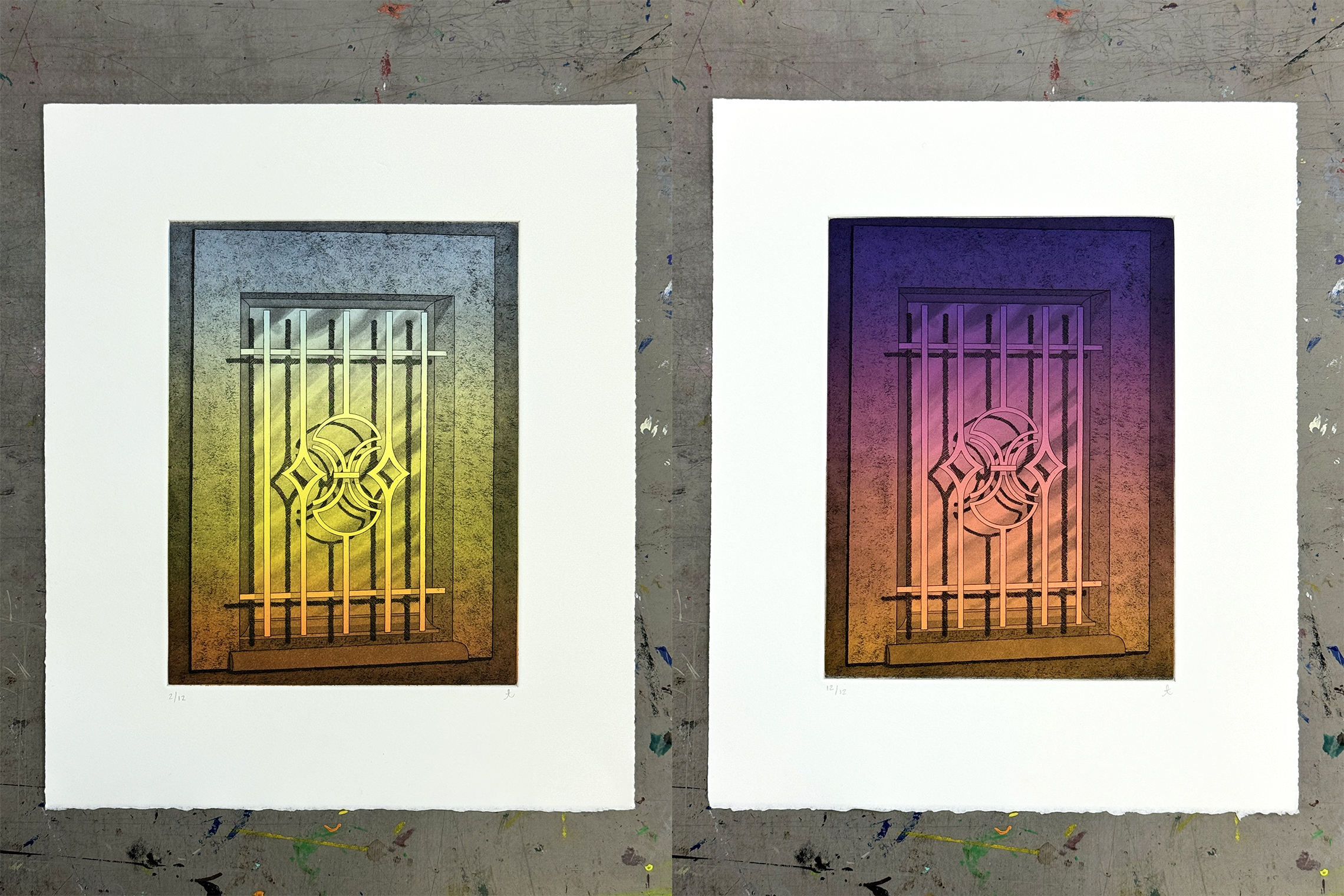 In Cascade (How will you know where to go?), Verified People of Print Member Aaron Pennington presents a series of two-plate aquatinted line etchings in a variable edition of twelve. Each print features the same architectural image: a grated window seen from a first-person viewpoint. Yet no two impressions are identical.
