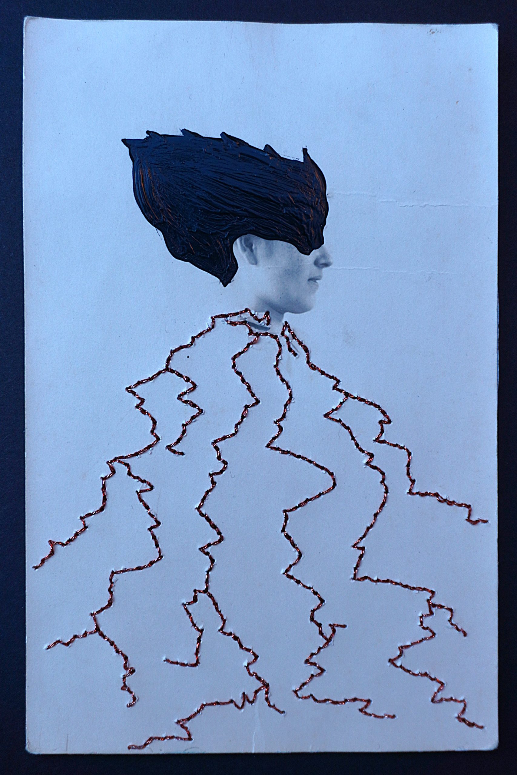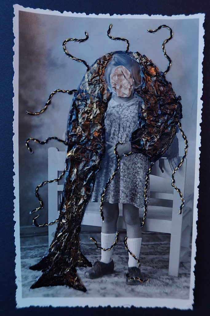 Ambu draws inspiration from artists who combine techniques such as embroidery and collage. Onto the found photographs he layers acrylic paint, metallic threads, recycled paper bakery bags, and old envelopes to create three-dimensional textures. The interventions are intuitive and developed in the moment, guided by what the image seems to suggest. He describes the atmosphere of the works as “like memories from parallel universes.”