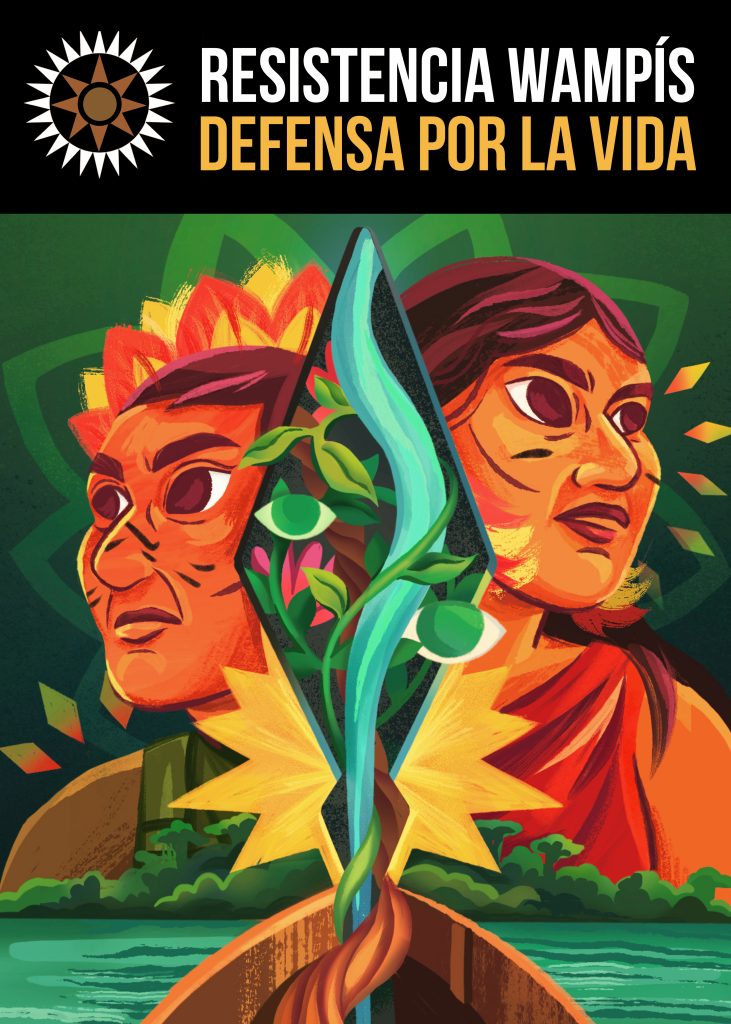 The illustration highlights the Wampís Nation’s ongoing struggle to protect their territory from environmental threats, particularly mining and extractive industries. It foregrounds their creative resistance and deep connection to land and water, emphasising autonomy, collective heritage, and the defence of life.