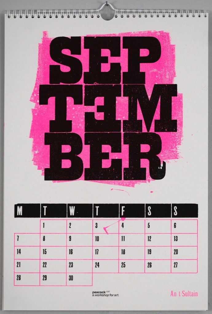 The Peacock 2026 Calendar was Risograph-printed using 7 colours (Aqua, Black, Blue, Bright Red, Fluorescent Orange, Fluorescent Pink & Teal), using letterpress text printed with a Hunter Penrose proofing press from wood type recovered from the old Castlegate printing works of James Daniel and Cornwall and Sons. The cover is letterpress printed, whilst the rest of the calendar is all Risograph printed.