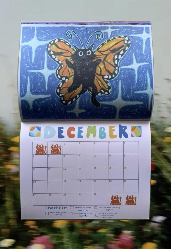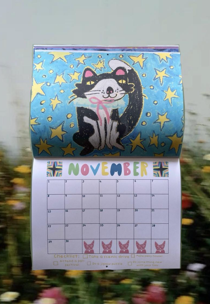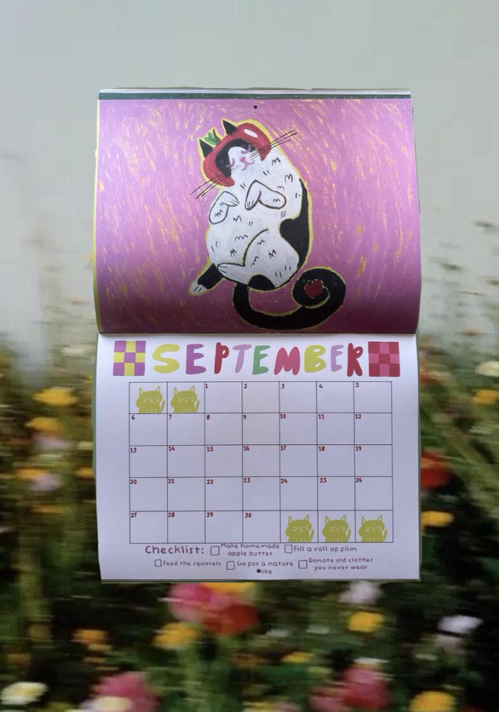 Kai Mosley, aka Existential Cowboy, is known for fun illustrations and incorporating them into textile art. This year, you can get a 2026 calendar featuring 12 iconic cat illustrations.