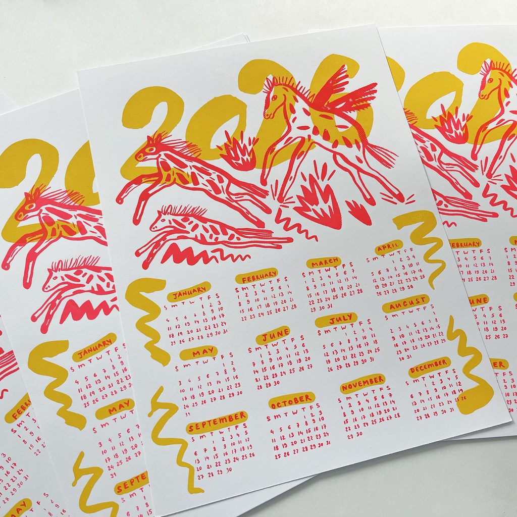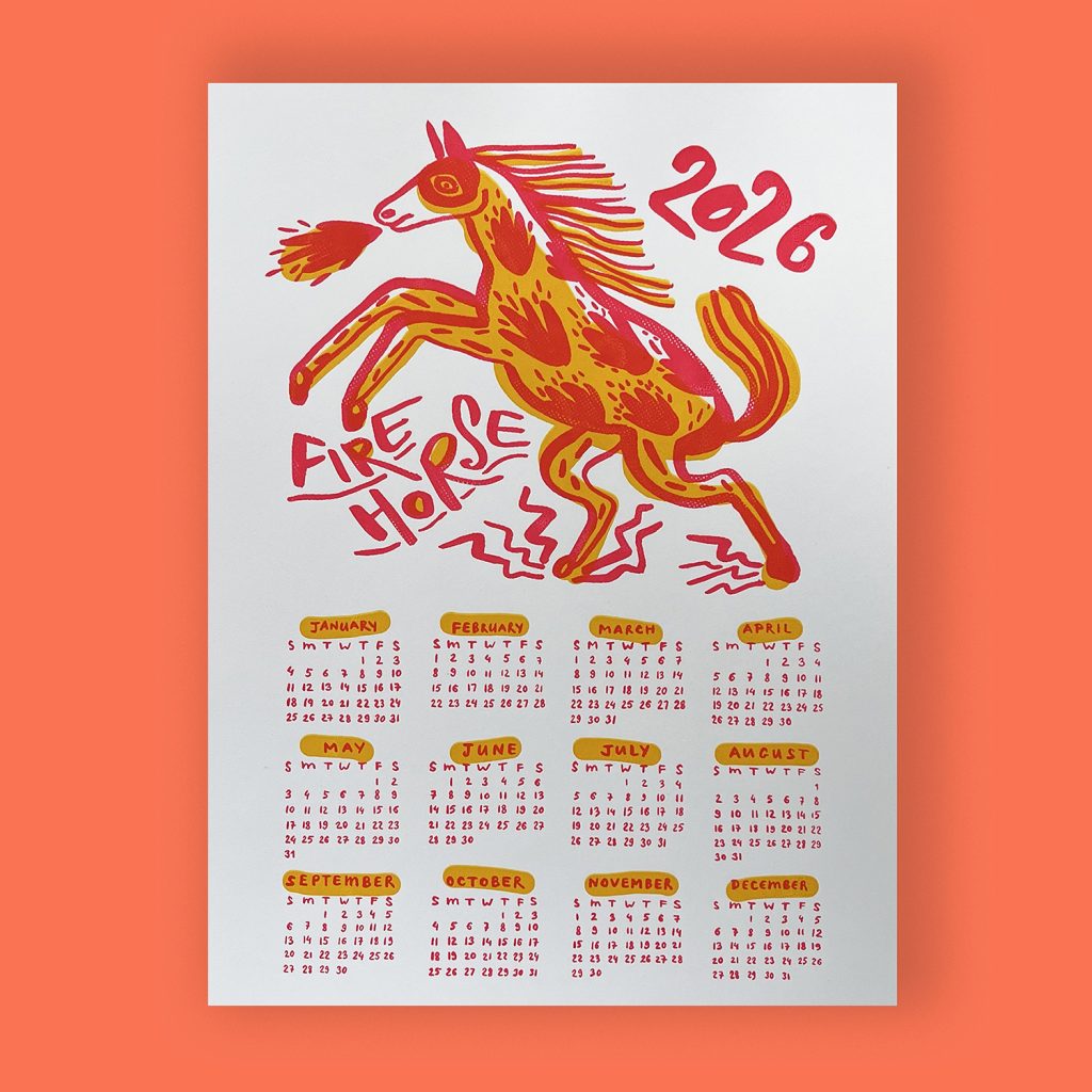 Natalya Balnova is a New York-based illustrator, designer and printmaker who is a big fan of lettering, silkscreen and poetry. This year, Natalya has created Fire Horse, a two-layer screenprinted calendar.