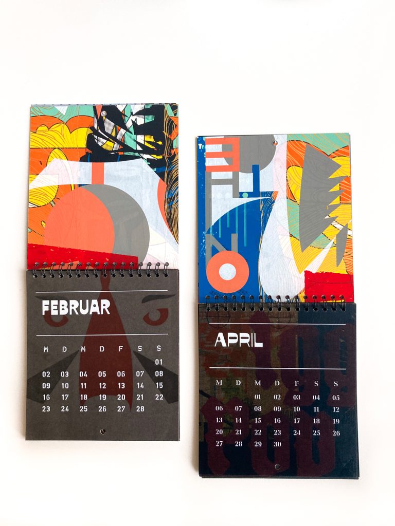 For this calendar, we used a few of our most beautiful test prints. We printed the calendar pages for the entire year on each test print, cut them to size, and mixed them.