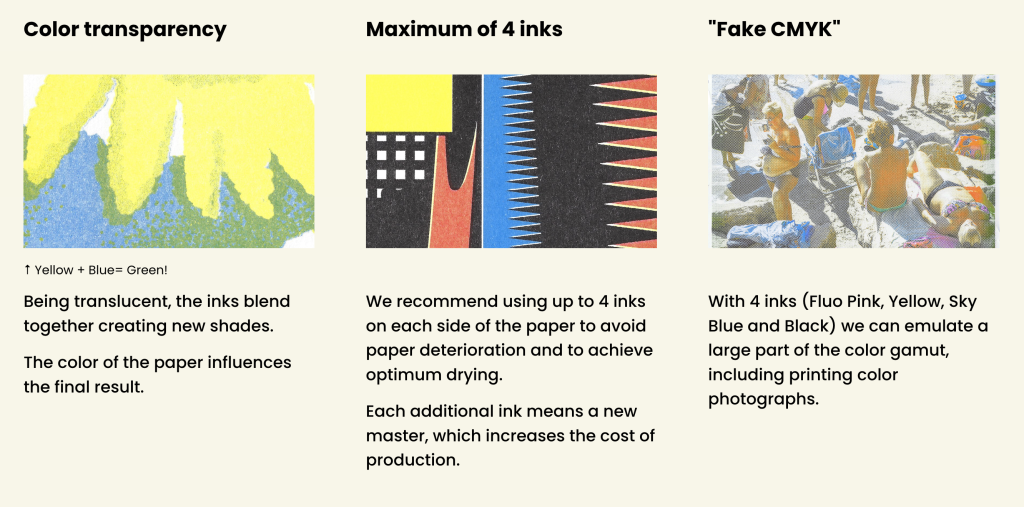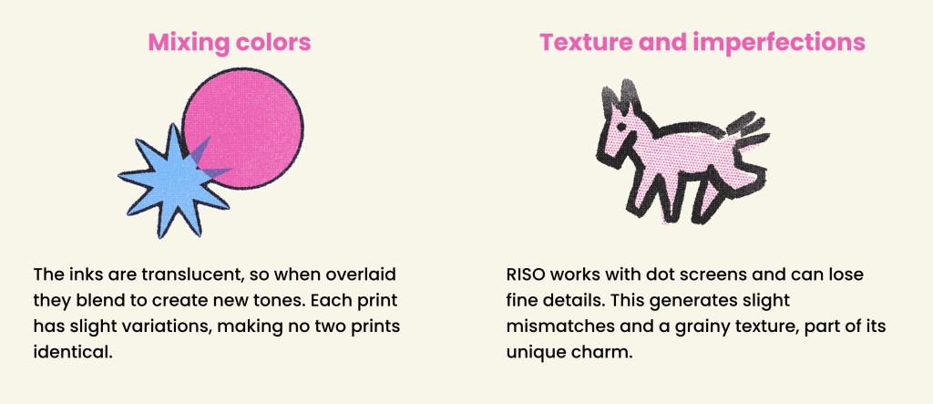 RISO was born in Japan in the 1980s and combines the best of photocopying and screen printing. It is distinguished by its vibrant colours, especially fluorescent ones, and its textured finish. It is also one of the most sustainable printing options with its soy-based inks.