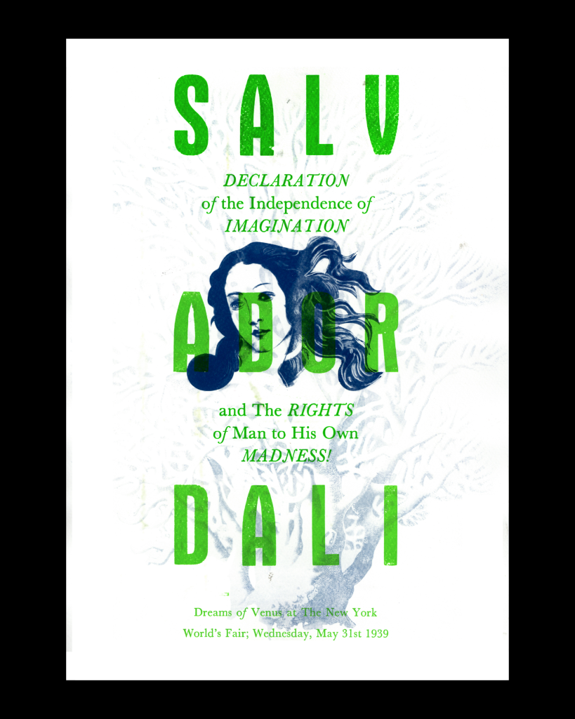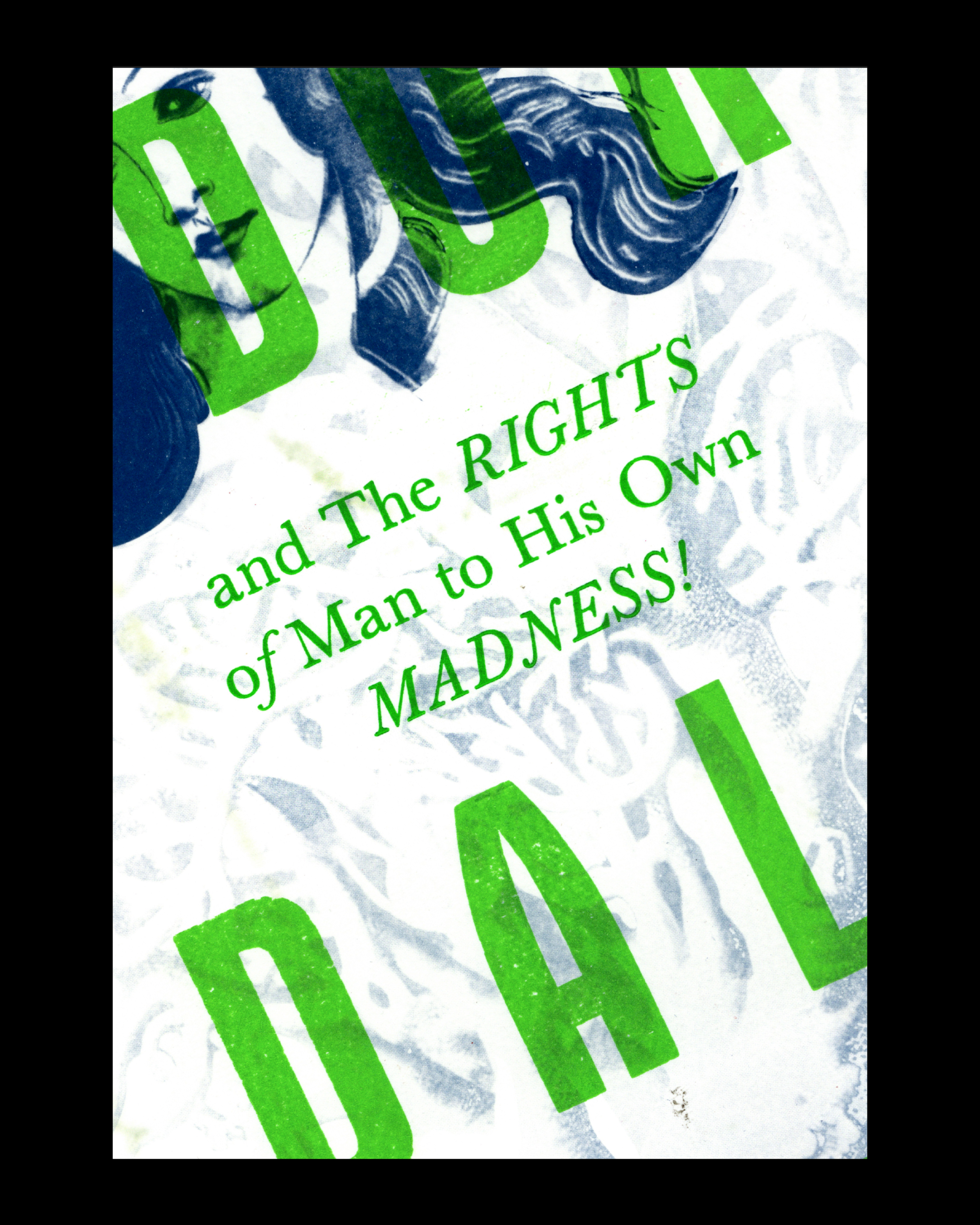 Letterpress printing was introduced as a typographic counterpart to the cyanotypes. Paranjape selected the process in response to the industrial sans serif and formal serif typefaces associated with printed matter from the 1930s. The typesetting draws from posters and flyers of the era, while accompanying texts written by Dalí establish a direct historical connection between image, language, and process.