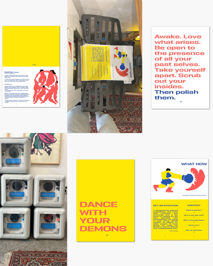 Mitkova was drawn to the concept of karmic relationships, which suggest that certain connections recur across lifetimes, carrying unresolved lessons or emotions forward. In the context of WHAT NOW, this idea becomes a lens through which she examines intense bonds, sudden shifts, and the lingering sense that some experiences arrive in order to push us toward clarity. The zine uses symbolism, text and layered imagery to reflect the cyclical nature of these moments, when growth comes from confronting what feels familiar yet difficult to understand.