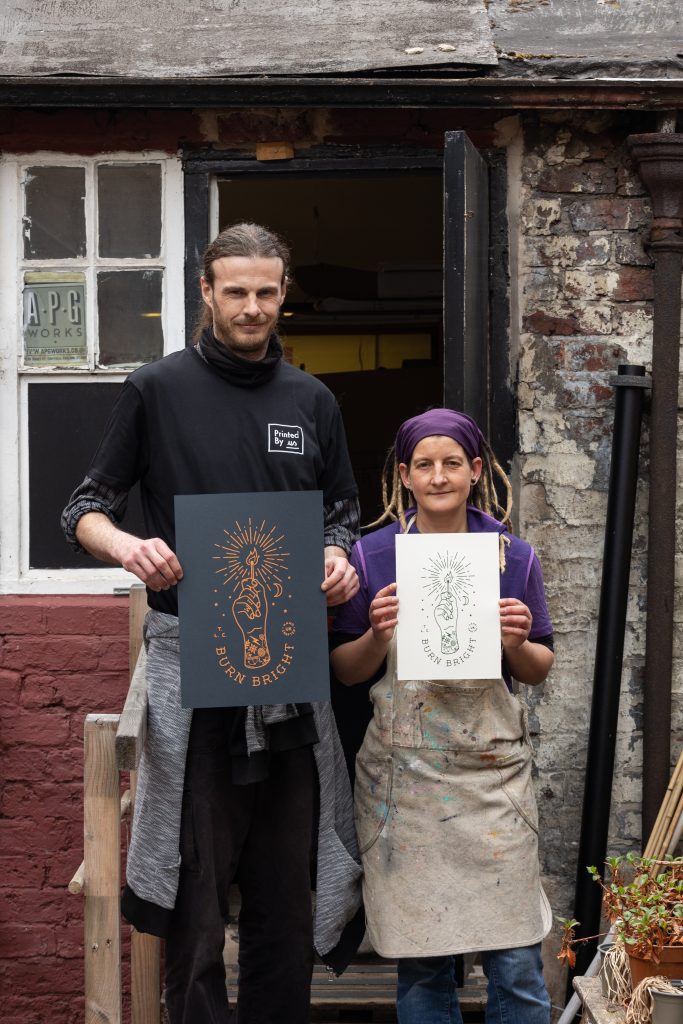 Every product we make tells a story. All our clothing is made ethically and organically from 100% fair wear cotton, using water-based inks. Our prints are crafted on premium recycled British card. Everyone in our supply chain is paid a real living wage, and all profits are reinvested into our workshops to grow our impact. Designed by incredible independent artists, printed in-house, and signed by both the artist and printer, our work is all about Printing Positive Change.