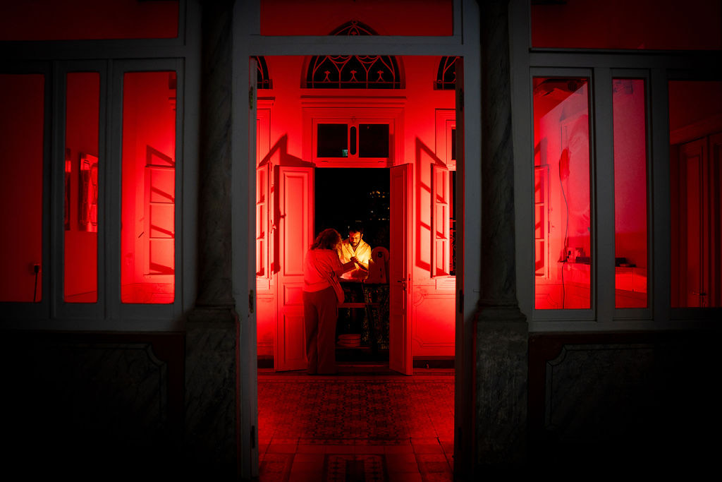Inside Beit Barakat, a preserved Ottoman-period building, two copies of Barricade Tape Arabesque #01 were installed. Printed in two colours on reflective cardboard, the works mirrored the motion and repetition of the live production outside, creating a dialogue between fixed print and performative process. The printed tape itself was allowed to spill over the balcony and onto the pavement below, marking a physical and conceptual collision between artistic labour, urban debris, and public territory.