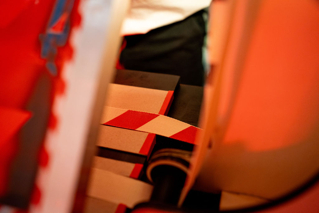 This fascination became the foundation for a performative printing act that unfolded in public view. During a trans-cultural event dedicated to performance art and dance, Farago was invited to create an absurd act of manufacturing. From a balcony overlooking the street below, he operated a self-made barricade-tape screen-printing machine, printing dozens of metres of woven cotton strap in bright red over the course of one evening.