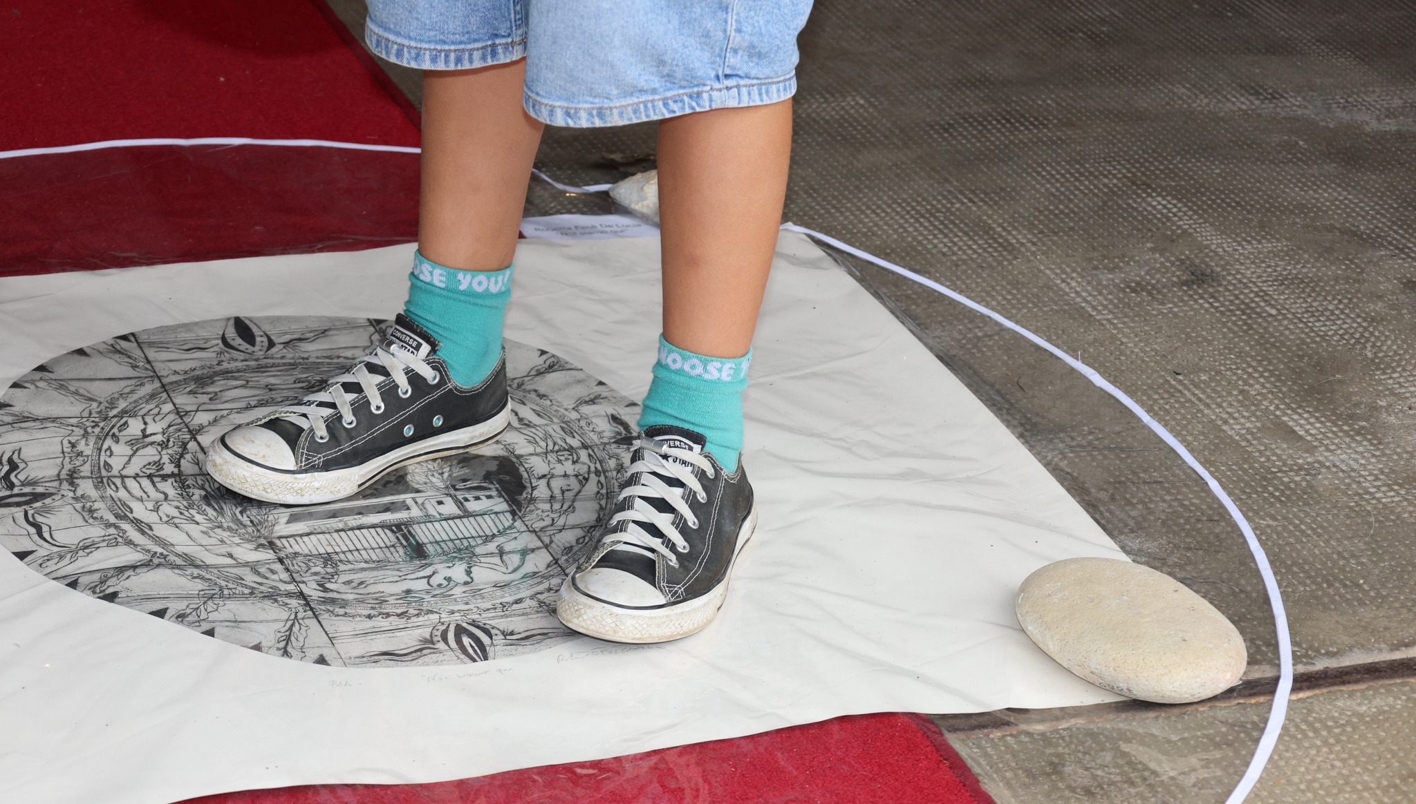 Drypoint, especially in its less-toxic contemporary adaptations, is often celebrated for its delicacy and careful craft. Yet Roberta subverts this expectation entirely. Rather than inscribing the plate in the studio, she placed a non-toxic drypoint plate in a communal area, allowing it to be stepped on, scuffed, dragged, and gradually abraded by passersby. The artwork unfolds through unintentional gestures: footsteps, pressure, friction. Over time, these incidental actions accumulate into a form of drawing—one authored as much by the public as by the artist.