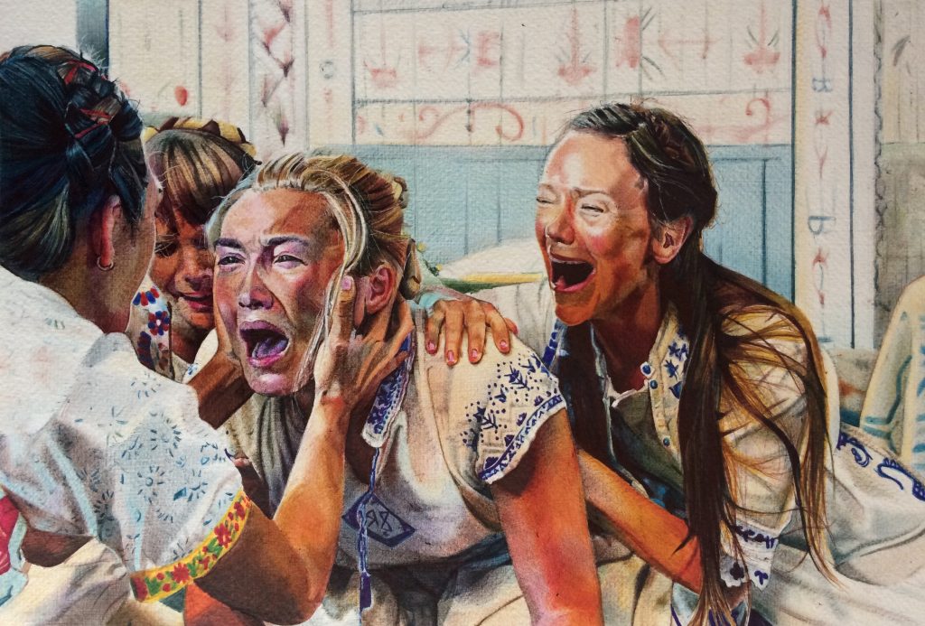 Stills, coloured ballpoint pen drawings. Films depicted: The Exorcist, A Nightmare on Elm Street, Midsommar, In the Mood for Love, Machuca. All works by Catatte Tapia.