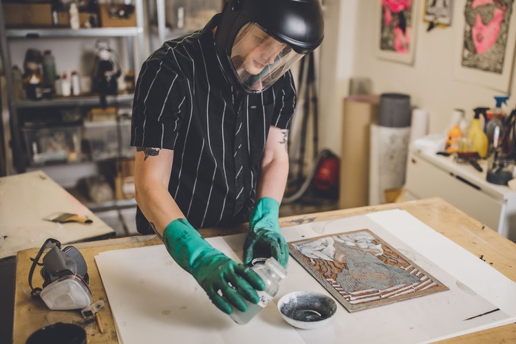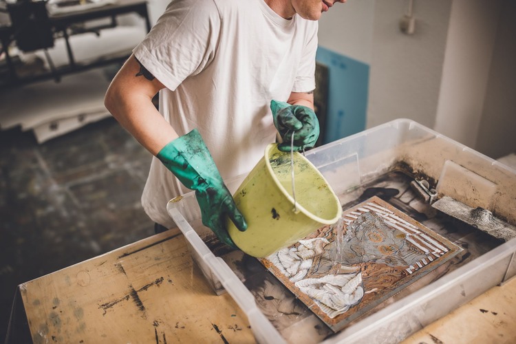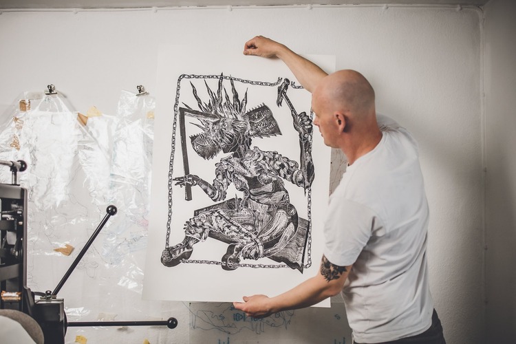 Over the last 10 years, Carsten has also developed his greatest passion for etched lino prints. After discovering the work of Steve Edwards and Aine Scannell online, Carsten’s path was set. For this printmaking method, he prefers to work with a sketch which he then transfers to the lino block using carbon paper. He explains; “I have gotten into the habit of doing most of the carving work before etching, as a large part of the sketch on the lino block is lost during this step”. After carving, he then prepares the block for etching, applying Lascaux hard resist or wax paint to protect certain areas. As the hard resist is transparent, he also mixes in a drop of acrylic paint (as opposed to the printing ink). Carsten uses applicator bottles (nail studio) for thin lines, crackle medium or coarse sponges for structures, or drypoint to work on the hard resist after it has dried. Then he gets etching. After an hour, the plate is rinsed with plenty of water and brushed off properly. Hard resist residue that has not been removed can later stick to the ink roller when inking the plate, so after brushing he goes over the linoleum plate again lightly with a paint spatula. When the plate is dry, he prints as usual.