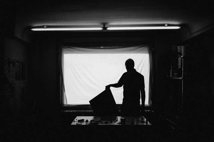 Carsten also works with PCB dry film Intaglio. When working on sketches for his designs, he often doesn’t know which technique he will go on to use. When working with intaglio, he often had difficulties transferring the sketch later. Thus, he quickly started applying photopolymer to copper and zinc plates so that he could expose sketches directly onto the plates. After purchasing PCB circuits on the internet (it is sold on rolls, well sealed, and consists of a bluish solid gel between two films) Carsten heads to the dark room where he works under yellow light (at a distance of about 2 meters from the light source). Once the metal plate is degreased, he removes the inner film of the dry film. Since water is needed to connect it to the metal plate, Carsten puts the metal plate in a bowl of water and places the dry film with the exposed side facing down on the plate in the water bath. When he now lifts the metal plate out, the dry film stays on this layer and can be easily moved back and forth until the desired position is reached. He then wipes off any excess water to the side, and turns the plate over and removes excess film with a knife. Carsten then runs the plate with the film through a laminator once or twice, and next leaves the plate wrapped up and in a dark drawer to dry for a day. After that, exposure can take place in a similar way to screen printing. Carsten uses a water bath with pure soda to wash it out, and can then print the plate directly or etch it using various methods.