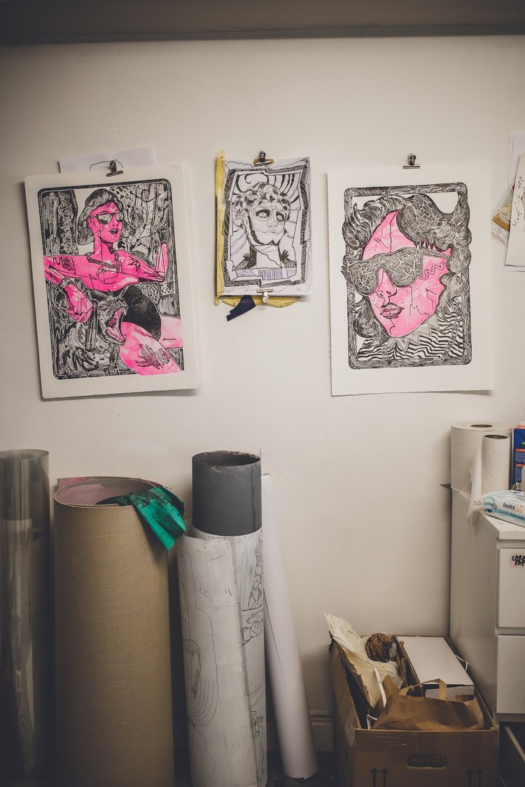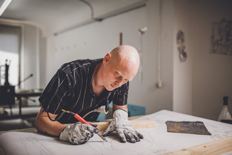 Carsten’s main source of inspiration for his creations comes from his passion for experimentation and his playful exploration of printmaking technique. Events from his own life and memories of youth also offer inspiration for his designs. However, there are also a lot of external influences on his works. He comments; “For example, if I see some interesting way of printing on the internet from another artist, it gets something working in me. It’s a bit like when you watch a cooking show and then want to try cooking spaghetti bolognese in your own way. Every family does it a little differently.”