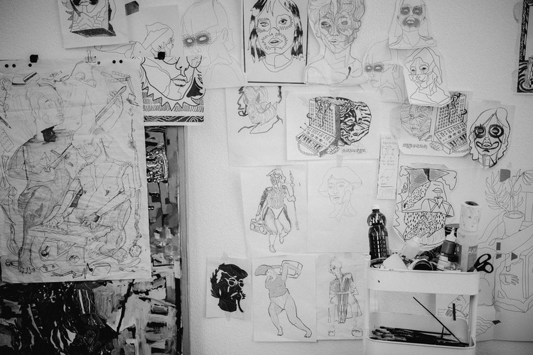 His stencil works begin with a drawing or a painted picture on printing paper. To create the stencils, Carsten transfers the relevant areas to another piece of paper. Once the stencil is cut out, he usually attaches it to the printing paper, using washi tape over the areas that are not to be printed. There are many ways to influence the structure of the print result; for example, Carsten likes to use yarn, thin wires, garbage bags, and leaves, creating results that are always unique.