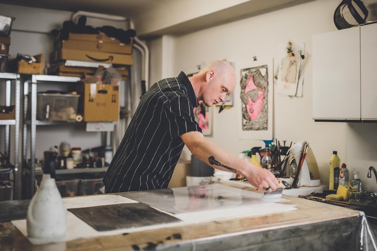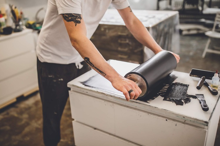 Carsten’s main source of inspiration for his creations comes from his passion for experimentation and his playful exploration of printmaking technique. Events from his own life and memories of youth also offer inspiration for his designs. However, there are also a lot of external influences on his works. He comments; “For example, if I see some interesting way of printing on the internet from another artist, it gets something working in me. It’s a bit like when you watch a cooking show and then want to try cooking spaghetti bolognese in your own way. Every family does it a little differently.”