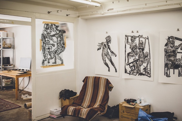 His stencil works begin with a drawing or a painted picture on printing paper. To create the stencils, Carsten transfers the relevant areas to another piece of paper. Once the stencil is cut out, he usually attaches it to the printing paper, using washi tape over the areas that are not to be printed. There are many ways to influence the structure of the print result; for example, Carsten likes to use yarn, thin wires, garbage bags, and leaves, creating results that are always unique.