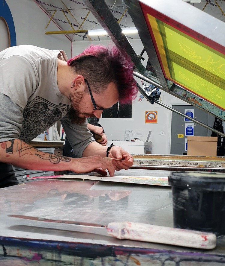 After completing a masters degree in Plant Genetics & Crop Improvement Chris ended up taking a job as a software tester for a company working in automated farming and applied GPS management software. While working there he got involved with Print to the People, an artist led studio with print rooms which had facilities for screen, relief, and intaglio printing, as well as letterpress, and even a Risograph machine. Chris comments; “It was so inspiring to be part of that group and though I had shown my artwork in local galleries I started to see a future for myself in art that was more than just a hobby”. Here, he not only learned how to print and run workshops, but it propelled him to start selling his work online. After leaving the software company, Chris focused on textile printing and worked part time as a print room technician at Norwich University of the Arts. He then I moved to London and joined the team at Print Club London. He remarks; “…it just goes to show, anyone out there with a creative fire who is maybe feeling stuck in their day job, it is possible to succeed in the arts on your own terms!”