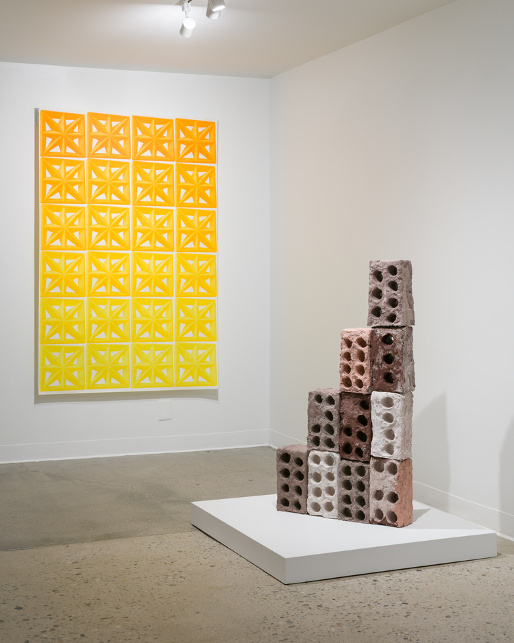 “I amble through the city in search of illuminations: silent monuments presenting symbolic form and human decision. My process begins through isolating specific moments and details found in the urban landscape through photo documented walks. The city’s concrete gridded layout, road signals, paint colors and built textures weave together a familiar pattern: an urban fabric from which I can pull apart the individual pieces. I grant a spatial story to these accumulations through my sculpture. I look at repetition, shape and texture. I am interested in how nature is represented within the city structure and how people connect to the constructed landscape.”