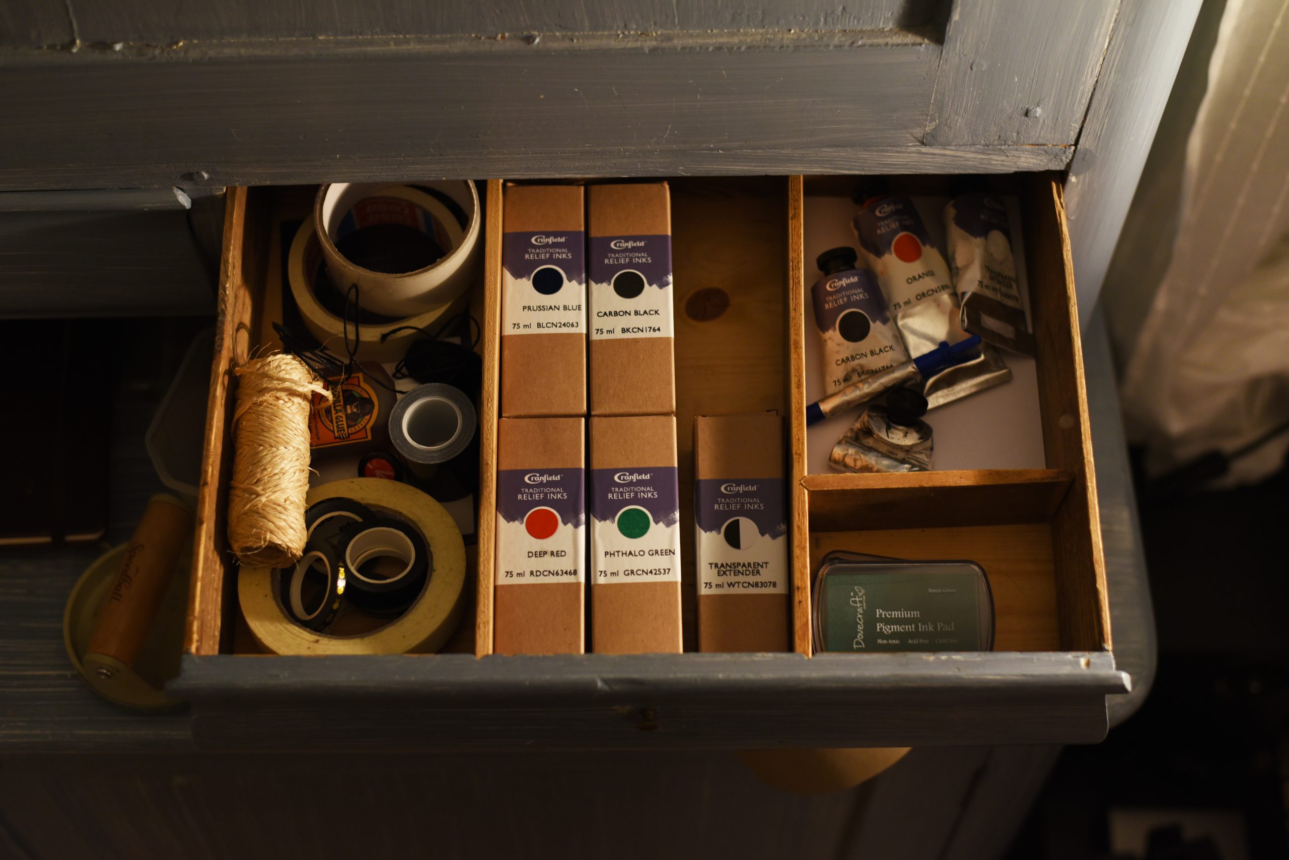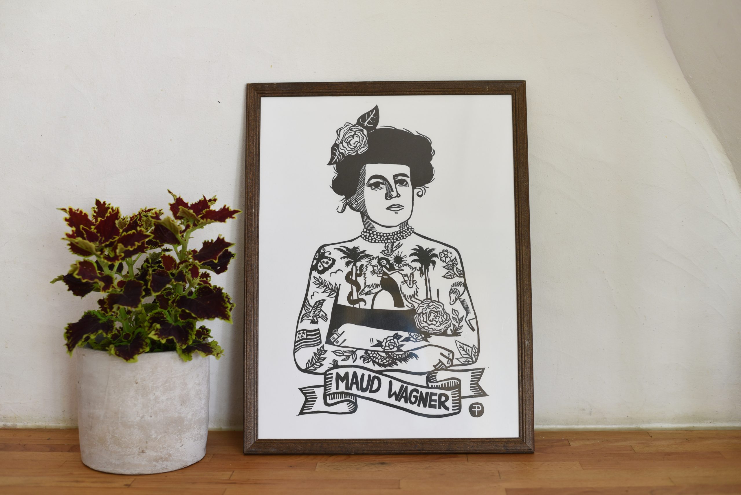 With the use of black ink becoming a defining feature of her work, Fia wants to step out of her comfort zone and start incorporating more colours into her art. She is also working on her registration skills so that she can use several printing blocks for the same design. Currently using an A3 Woodzilla press to print her pieces, Fia hopes to one day work with a large cylinder press which will enable her to make larger quantities of prints.