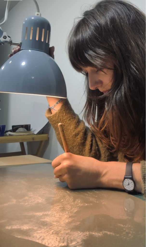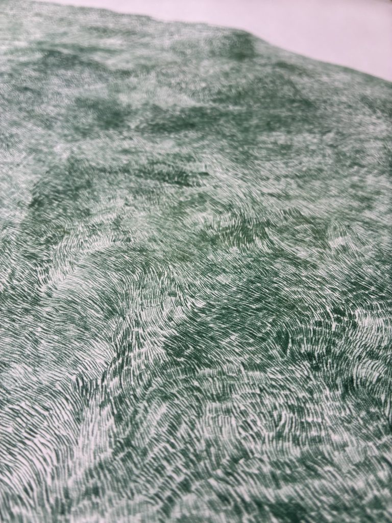 A central conceptual focus of Grass is the relationship between grass and wind. Grass depends on wind for pollination and seed dispersal, while wind becomes visible only through the movement of grass. In this poetically symbiotic exchange, an invisible force is given form through motion. The print reflects this relationship not through representation, but through process. Individual strokes were scratched directly into the plastic plate with an etching needle, each mark acting as a single blade of grass. The repetitive, meditative nature of the technique mirrors growth itself, allowing the image to emerge gradually over time.