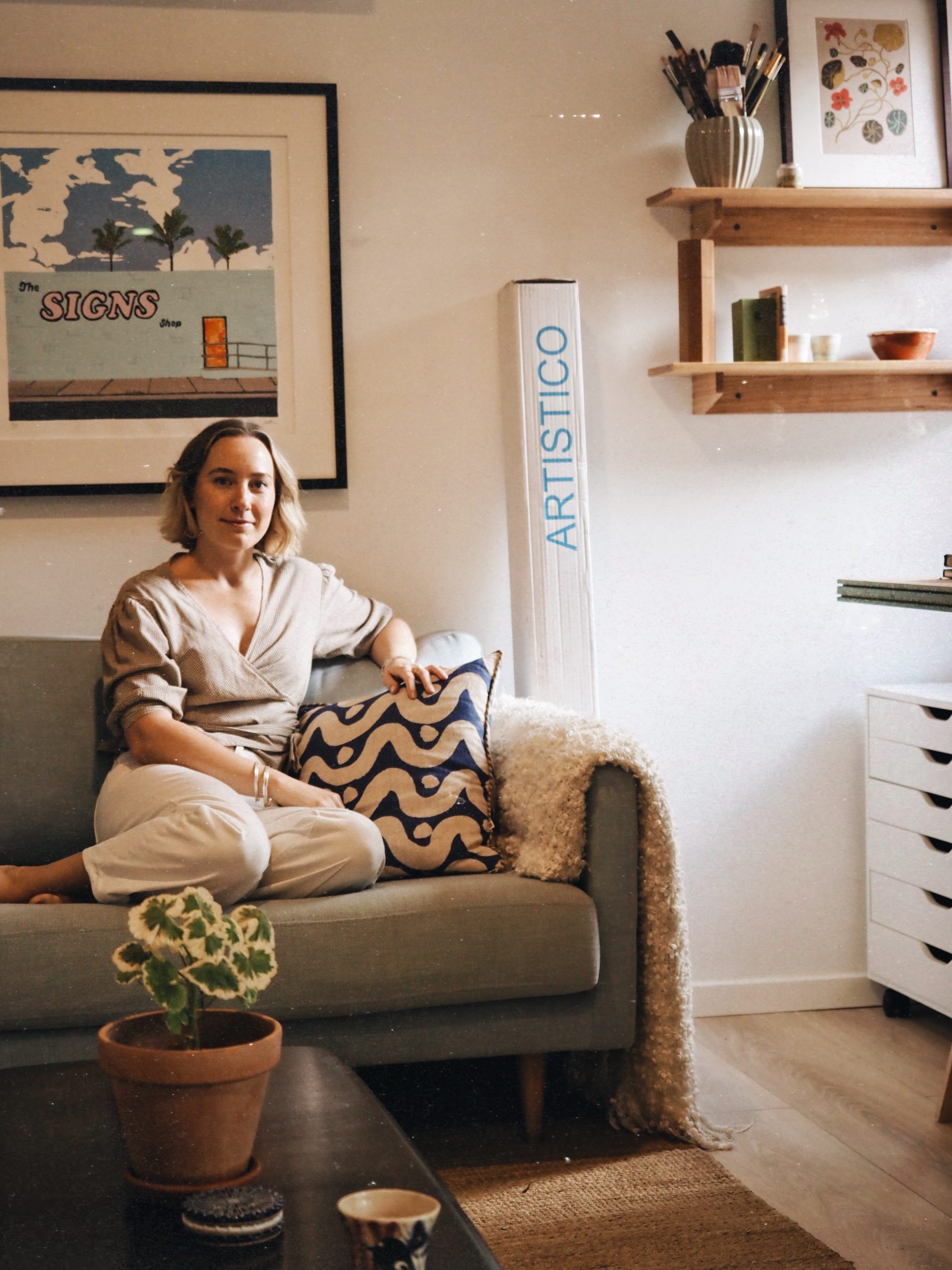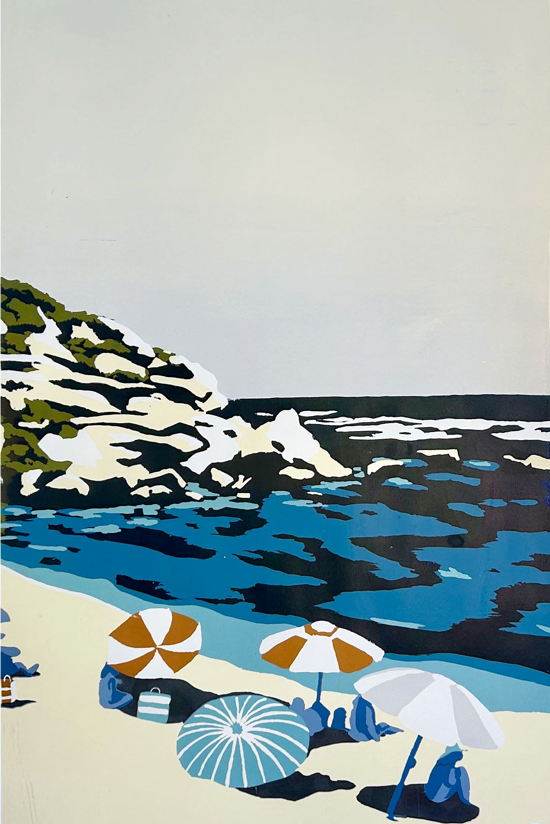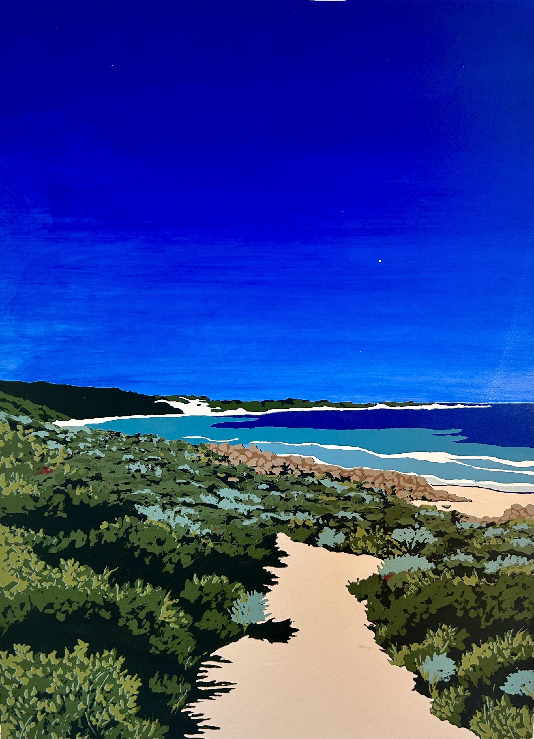 Currently, Jess creates her screenprints from her home studio in between days lecturing. She now lives on the outskirts of the Carbunup River nature reserve, a small pocket of bushland that is home to some of the rearrest spider orchids in the world (only 10 each year!). This rugged local landscape, abundant with red granite rock and the turquoise blue waters of the Indian ocean is infused into her designs. Jess describes; “I aim to simplify all the colours we can see out in nature into the most essential, and recreate this in a simplified version to capture the essence of the moment.” She continues; “By simplifying the intricacies of the landscape into layers of bold colour, I invite the viewer to experience the landscape anew – not as a faithful representation, but as a distillation of its most fundamental qualities.”