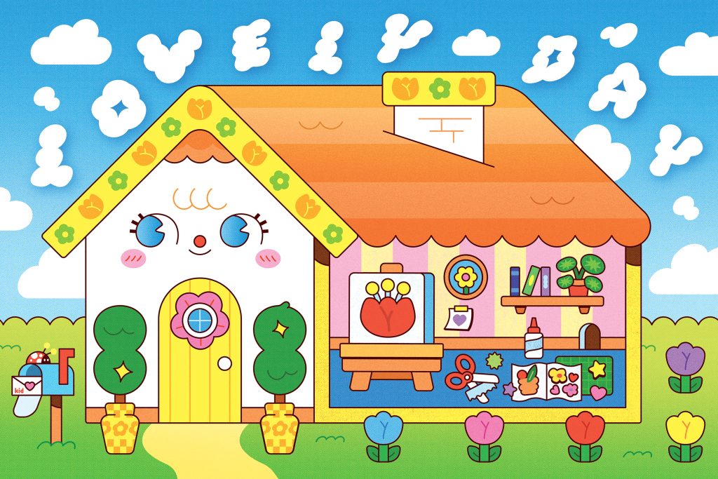 Although created digitally using Illustrator and Photoshop, Lovely Day carries a strong tactile quality. Nichols leans into her background in print production by incorporating nostalgic halftone textures, bringing a sense of hands-on making into the digital image. Bold colour, confident linework, and layered texture work together to create a space that feels warm and approachable, blurring the line between illustration and environment.