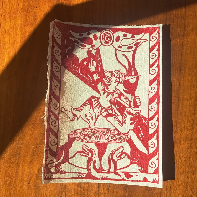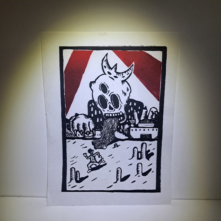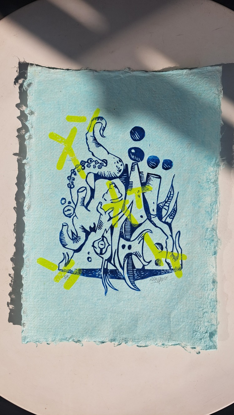 Rayzam is Mazyar, a professional product design, and creative linocut artist. Working from Lyon, France, by day he creates digital interfaces, but outside of working hours focuses his time on carving lino.