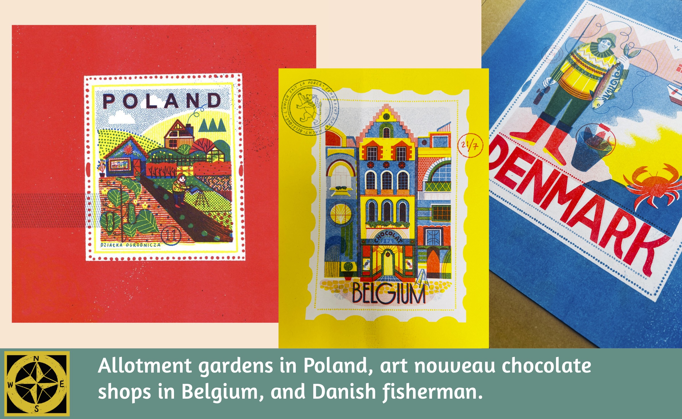 Colour is vitally important to Rhi’s work. She comments; “Colour is so powerful—so atmospheric. I’ve always loved how a simple colour palette can evoke a whole memory or mood.” Thus, it is one of the first things she decides on for each stamp, and since they’re all made with a limited set of three Risograph inks, getting the colour combinations right is crucial. Her choice of background colour for each piece is sometimes influenced by flags, but more often by folk art, textiles, or the particular quality of light she remembers from that place. For example, her Ukraine print is the only one that utilises an intense fluoro pink, which is directly inspired by vintage children’s books and maps Rhi picked up in a Kyiv street market in 2016. She tells us; “I created that print before the full-scale invasion, and later used it to raise thousands in donations for people fleeing the conflict. That’s something I’m incredibly proud of.” Rhi also loves hiding little details, or “Easter Eggs” in her backgrounds, such as; icons in the franking marks that nod to key cultural symbols, and dates in the postmark numbers that reference a national day or independence anniversary.