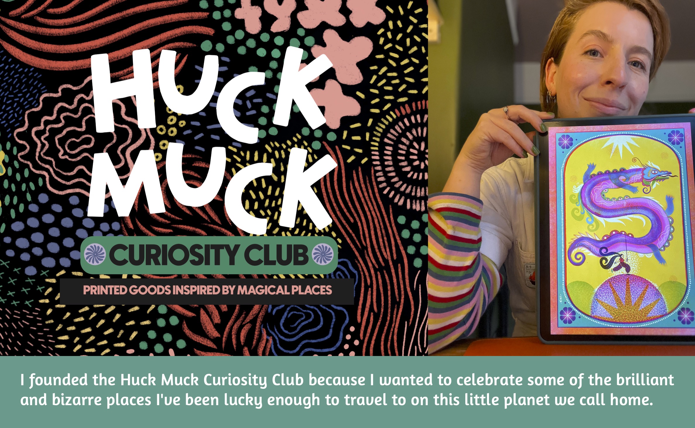 Describing her illustration practice in a nutshell, Rhi Moxon says; “I draw people, places, and things that bring me joy”. Her work, which blends vibrant colour, symbolic detail, and a sense of wonder is inspired by travel, nature, memory, and dreamlike narratives. Rhi’s Huck Muck series is testament to this; comprising an ever-expanding collection of travel stamp Risograph prints, based on the sights and sounds, tastes and encounters of her travels around the world.