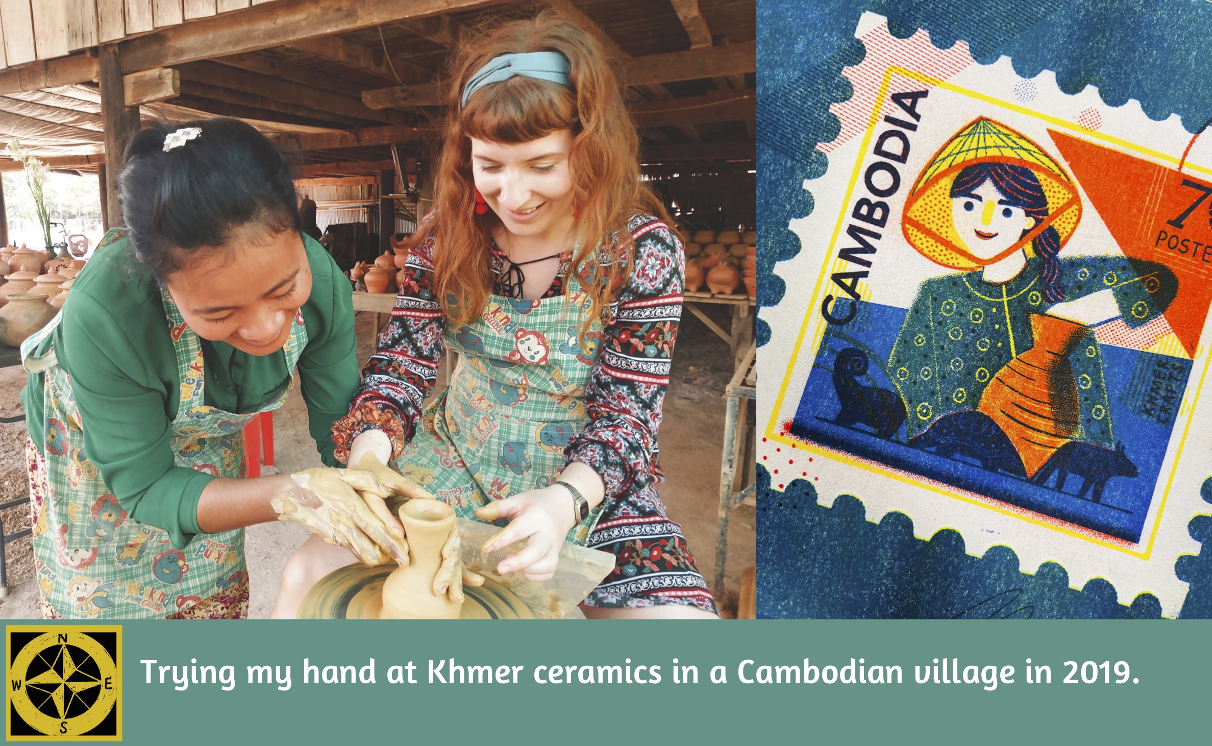 Each design in the series began by looking at photos, written memories, and sketchbook studies from the place. From there, Rhi started developing a colour palette and choosing what elements to include. “One of the great things about the stamp format is that it frees me from needing to show landmarks or famous tourist spots. Instead, I focus on lesser-known aspects—like a dish, a dance style, or a unique craft. Those are the things I seek out when travelling,” says the illustrator.