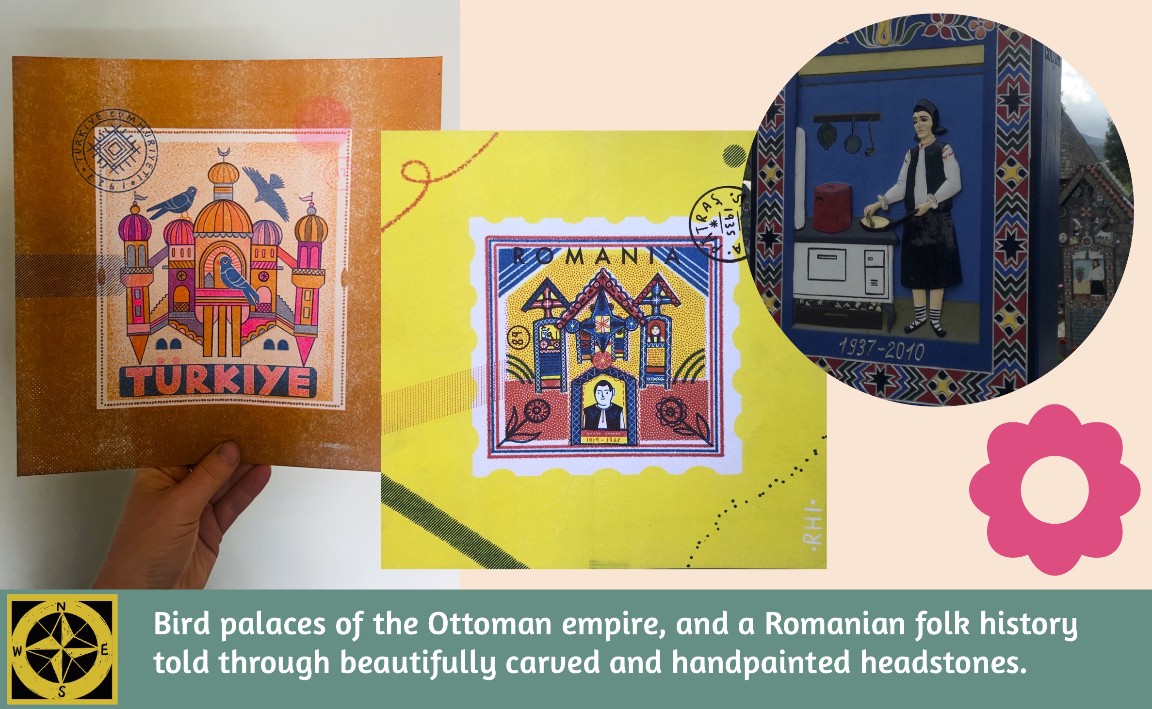 Rhi highlights resources such as Atlas Obscura as brilliant ways for uncovering hidden gems. For example: the Romania print was inspired by the Merry Cemetery of Sapanta, with its hand-carved, colourful headstones; and the Turkiye print celebrates the intricate Bird Palaces of the Ottoman Empire which are still visible if you look up while wandering around Istanbul. Other times, inspiration for the designs comes from more personal experiences: a road trip through the Caucasus in Georgia, morning runs through allotment gardens in Poland, or her growing fascination with Chinese opera.