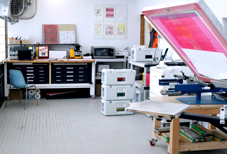 The studio’s speciality lies in custom printing for small businesses and independent artists, for which they use a combination of screen printing and Risograph techniques. Their studio is equipped with: a six-colour manual screen printing press; an exposure unit, washout booth, and conveyor dryer; a single-head M&R large-format press for flatstock up to 36 inches; a Risograph SF5130 printer; and a Paper Guillotine, saddle stitch stapler, and corner rounder.