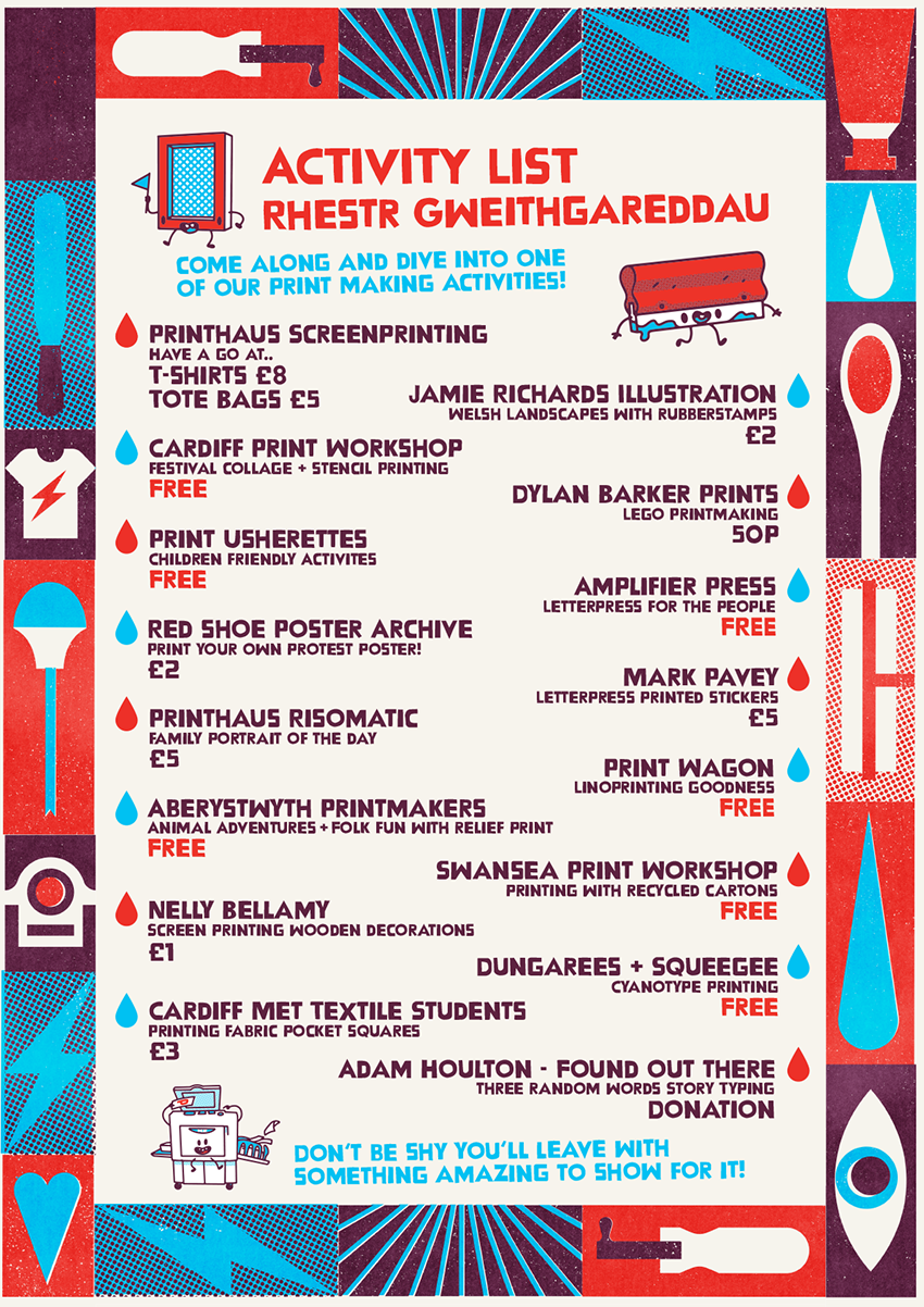 The festival has branched out over the last few years, involving numerous organisations and studios. This year, the line-up includes: Swansea Print Workshop, Aberystwyth Printmakers, Dungarees & Squeegees, Red Shoe Poster Archive, and Cardiff Met University – Textiles. Canton, the area of Cardiff where the festival takes place, is already a print hub in its own right. The following neighbouring organisations will also feature: Cardiff Print Workshop, The Amplifier Press, Art Market Cardiff, ArtHole, Oriel Canfas, The Printhaus, Prints of Hay, and Cardiff Illustration Club.