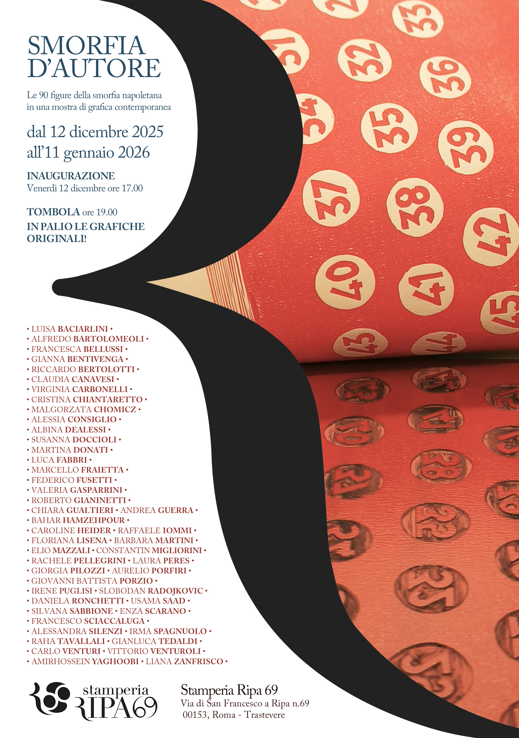 “LA SMORFIA D’AUTORE” The 90 figures of the Neapolitan Smorfia in a contemporary graphic design exhibition from December 12, 2025 to January 11, 2026 INAUGURATION Friday, December 12, from 5:00 PM BINGO at 7:00 PM ORIGINAL GRAPHICS UP FOR GRABS! Ripa Printing House 69 Via di San Francesco a Ripa…