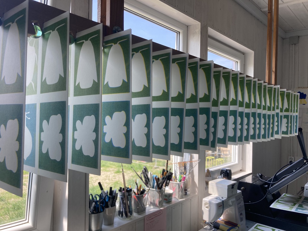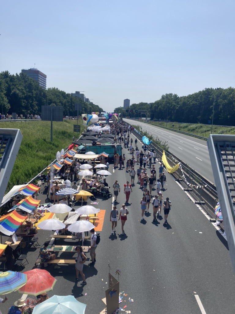 After getting involved with Amsterdam’s 750 Festival following an open call for artists, the pair were invited to host a workshop on the motorway around the city. The festival marks the 750th Birthday of Amsterdam, with events taking place across the city dedicated to the festivity. The biggest celebration took place on the longest day of the year, 21st of June, and was located on the highway. Daria describes; “It’s a very unique occasion that the city was practically closed for the cars for a whole day. and people were walking, biking and rollerskating on the highway!” It was unusual to host a workshop in such setting, so, of course, they weren’t able to bring their Riso printer to the location. This prompted them to be creative, and use discarded Riso masters as a tool instead.