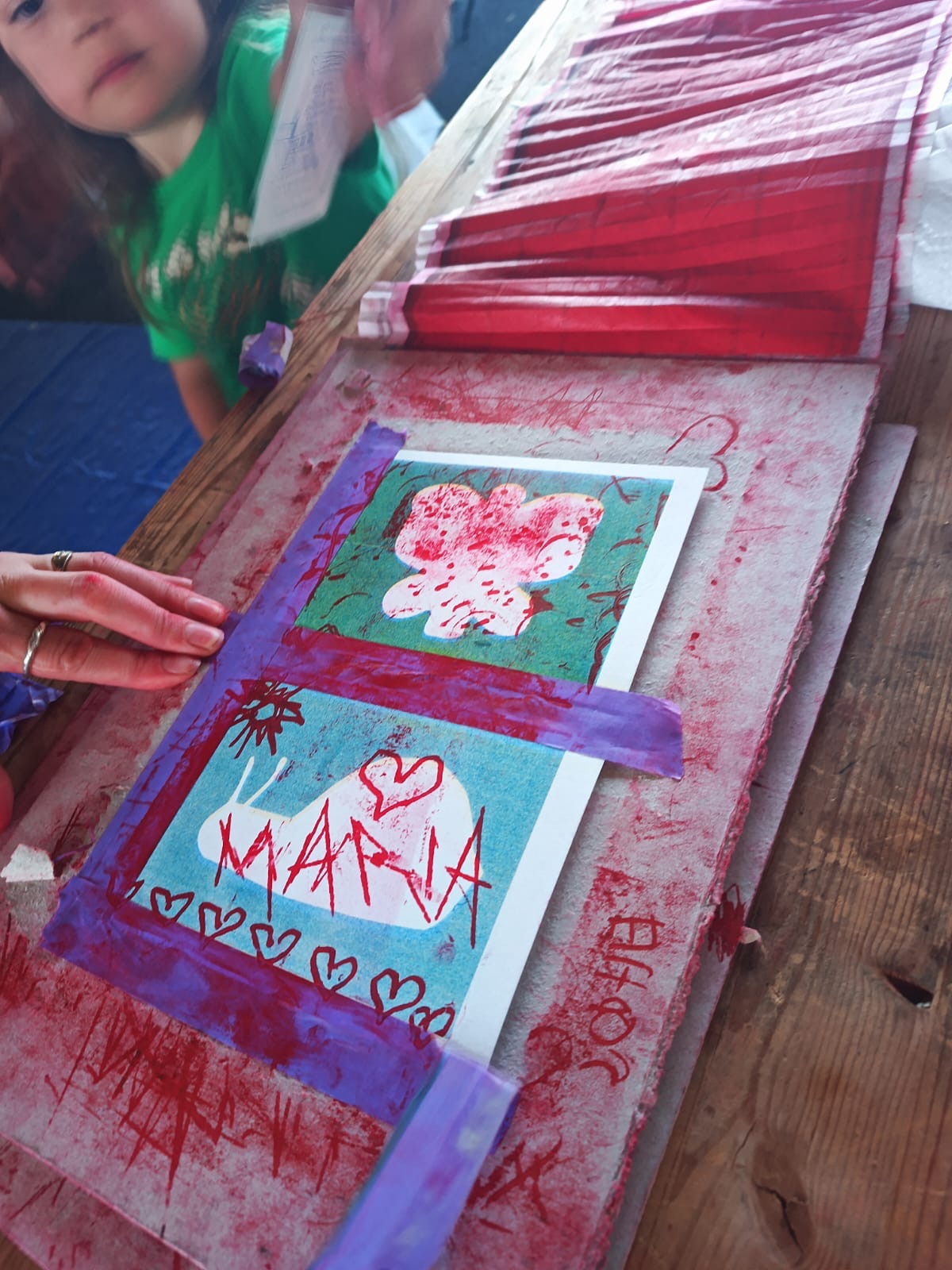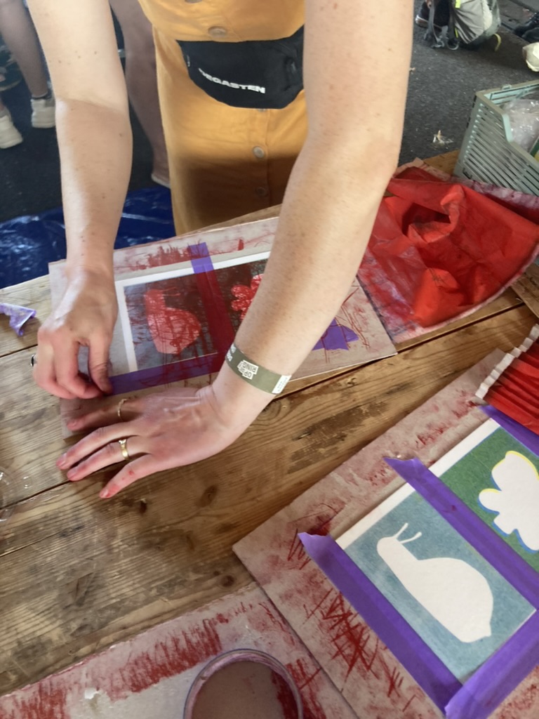 Usually hosting workshops in their studio for small groups of 6-8 people, this was an exciting step up for Studio Vlinderboom. Daria tells us; “There are always people in the group who are more familiar with the art of printing and those who are experiencing for the first time. It’s always inspiring to see what kind of discoveries participants make during the workshop. And the joyful faces of child-like play bring us happiness.” Most of the participants in this workshop were children, but no matter the age, participants showed great interest and dedication to scrubbing the ink through using peculiar tools.